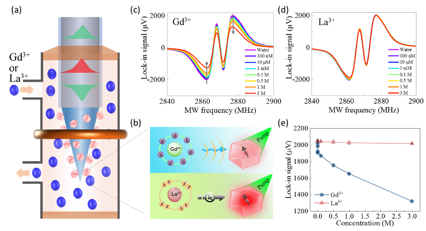 Fig. 5 (a) Schematic diagram of PS sensing using microfluidic tubes. (b) Schematic diagram of paramagnetic Gd3+ acting on nanodiamond NV color centers and non-paramagnetic La3+ with no interaction with NV color centers (c, d) LI-ODMR spectra measured at different concentrations of Gd3+ and La3+. (e) Dependence of the lock-in signal on the concentration at a fixed 2877 MHz frequency of the signal source.